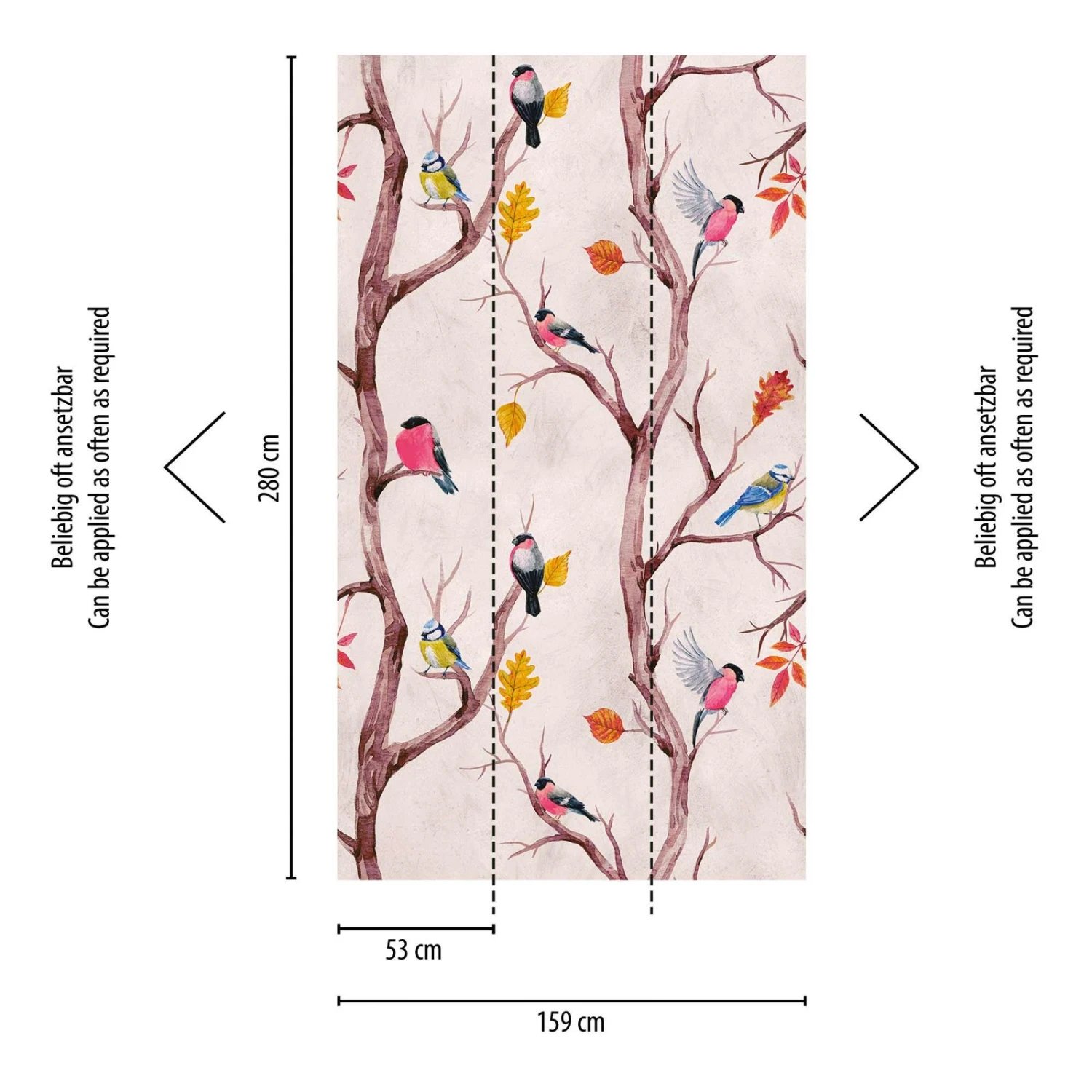 Digitaldruck mit kleinen Vögeln auf Bäumen in rosa, braun, blau – 38230-1 | 382301