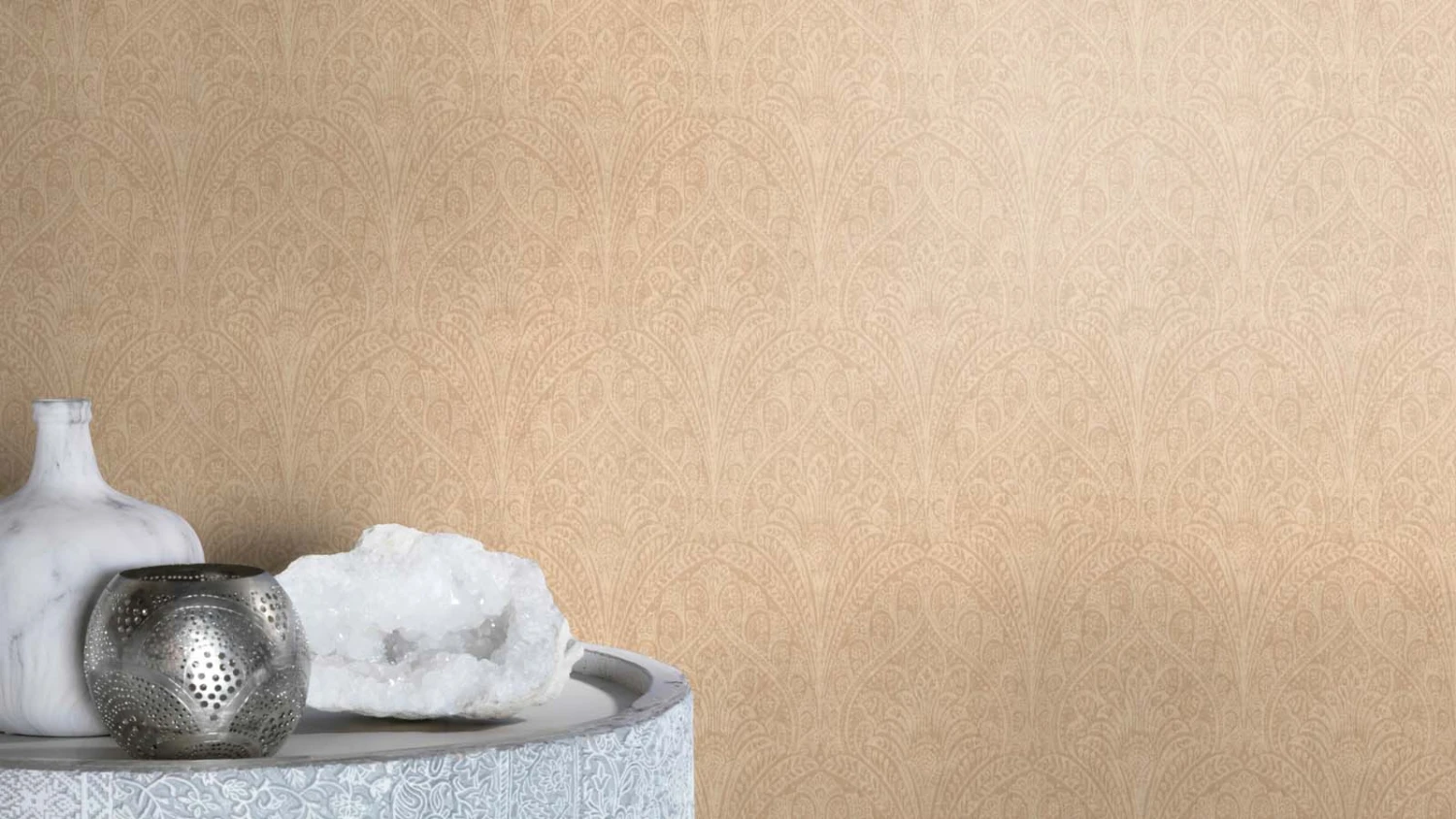 Diese Tapete aus der Kollektion Indian Style von Rasch nimmt dich mit auf eine Reise nach Indien. Inspiriert von prachtvollen Palastgärten und kunstvollen Grafiken bringen dir die Tapeten der Kollektion orientalisches Flair nach Hause. Die Vliestapete 746327 zeigt ein Muster mit Ornamenten im Paisley-Stil, die an indisches Henna erinnern in Beigetönen mit dezentem Metallic-Effekt. Entdecke auch die weiteren Tapeten dieser Vliestapetenkollektion bei uns im Shop.